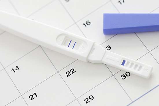 Uncapped pregnancy test showing two blue lines (positive) with blue cap nearby, arranged on a calendar