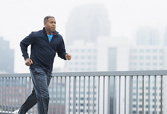 A middle-aged man wearing a blue zip top and lighter blue track pants running alongside a blurred cityscape