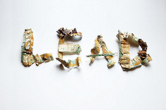 Peeling pieces of paint arranged to spell the word lead; concept is lead poisoning