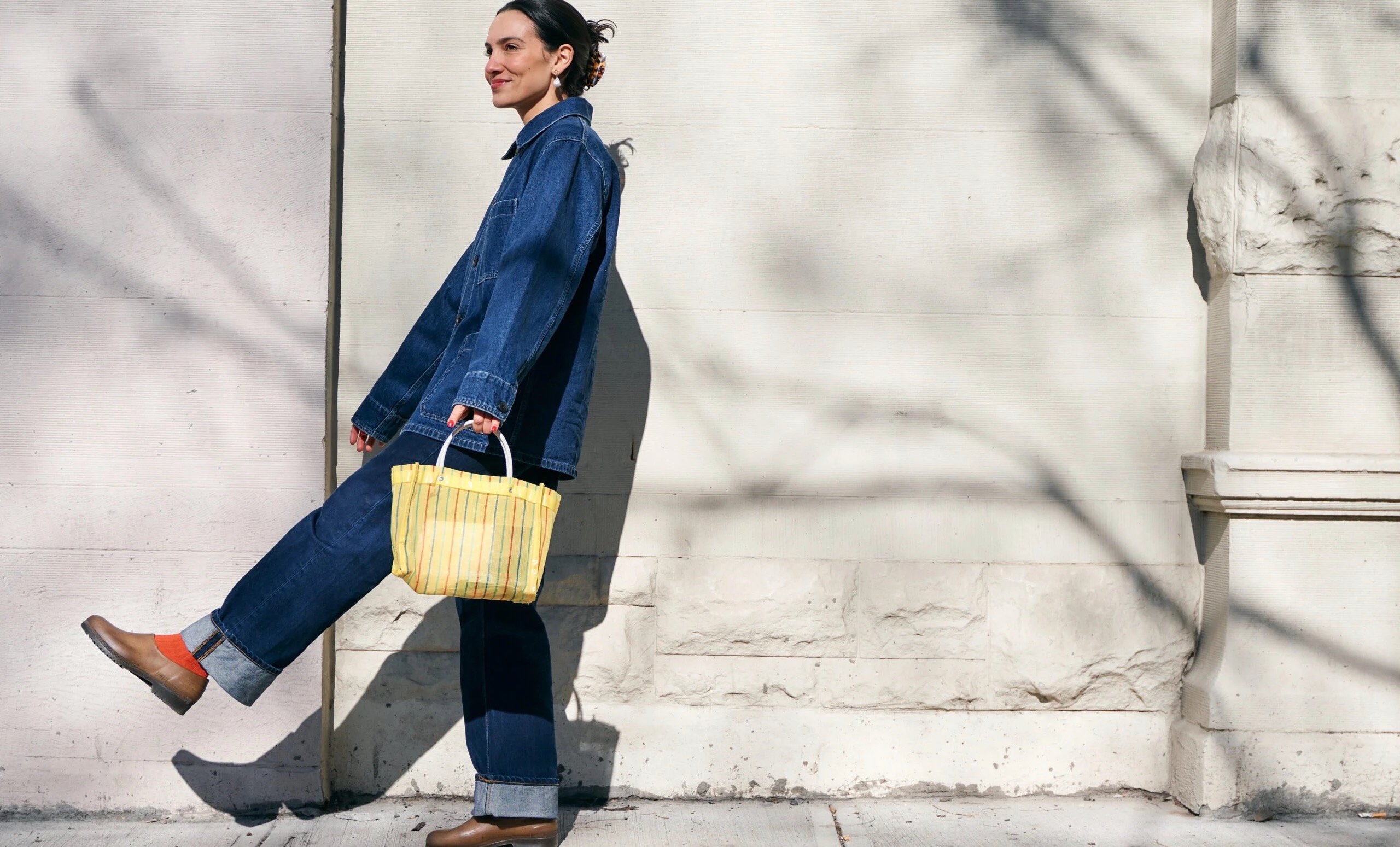 Chore coat: Uniqlo. Denims: Nudie Denims. Clogs: Plasticana. Bag: Mexican market tote, related. Socks: Madewell, related.