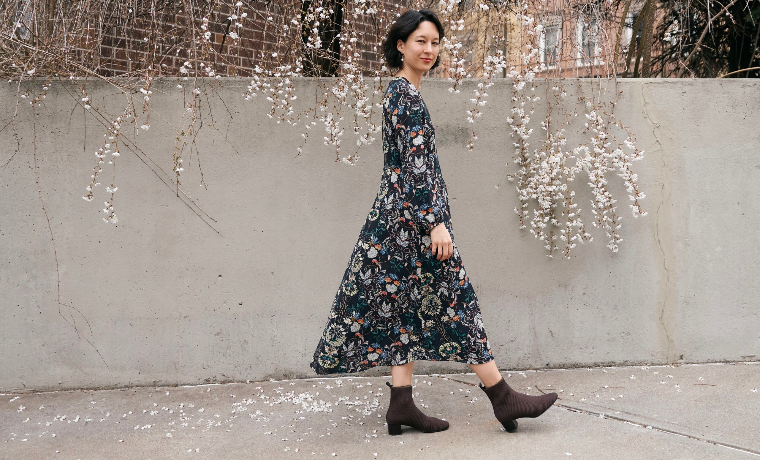 Gown: Zara, related. Earrings: Louise Damas. Boots: Everlane.