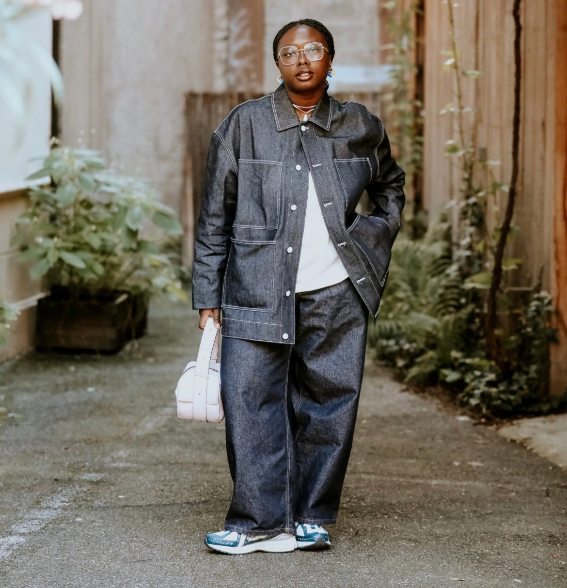Shirt: Elwood. Denim jacket: Estudio Niksen. Pants: Estudio Niksen, comparable. Bag: Sunnei. Sneakers: New Stability. Earrings: Sunnei. Rings: thrifted.